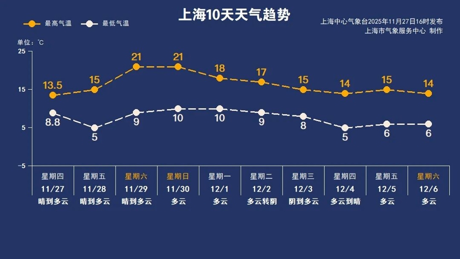 好消息是:这个双休日(11月29-30日)天气晴朗,气温猛升,周日最高可达21℃! 堪称“洗晒出游黄金窗口”。